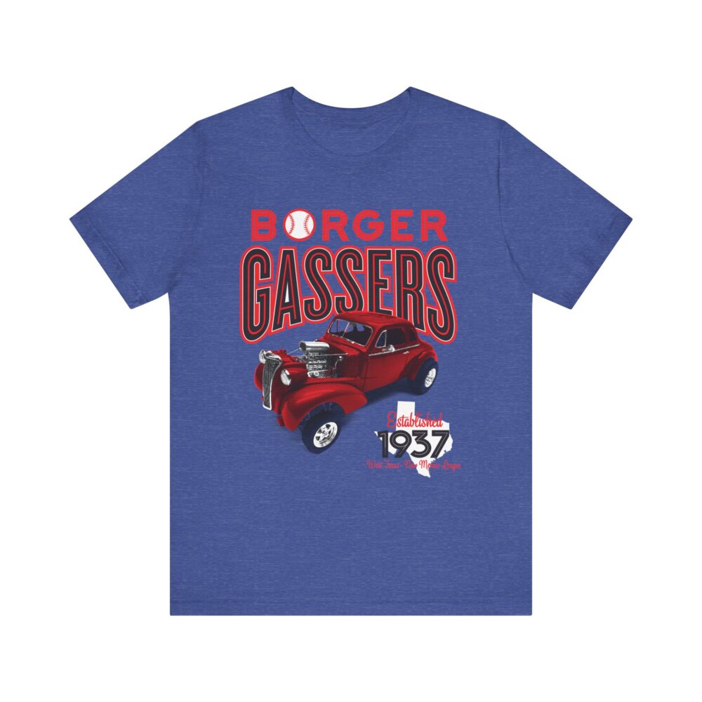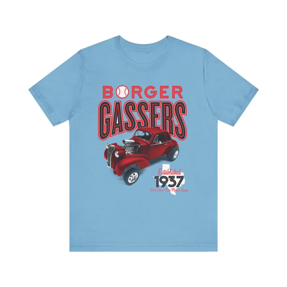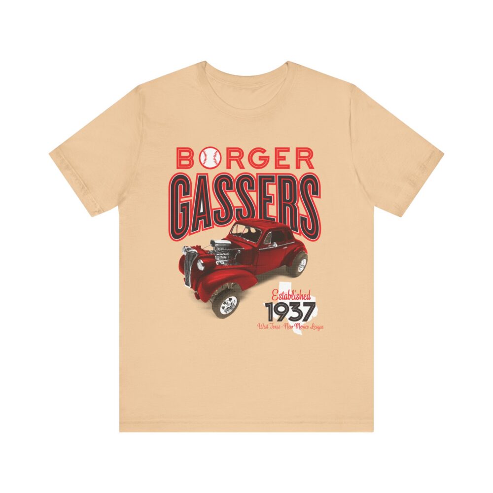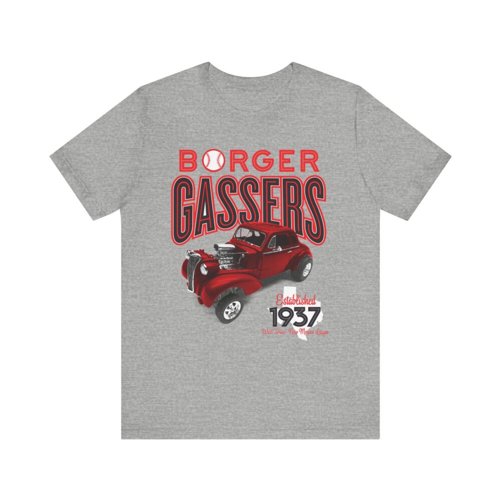 Borger Gassers Baseball T-Shirt pays tribute to the 1937 team from the West Texas–New Mexico League, capturing the energy of the oil boomtown and the grit of grassroots baseball. With a roaring hot rod front and center, this tee fuses automotive flair with classic baseball pride — perfect for fans of vintage speed and small-town sports legacy.