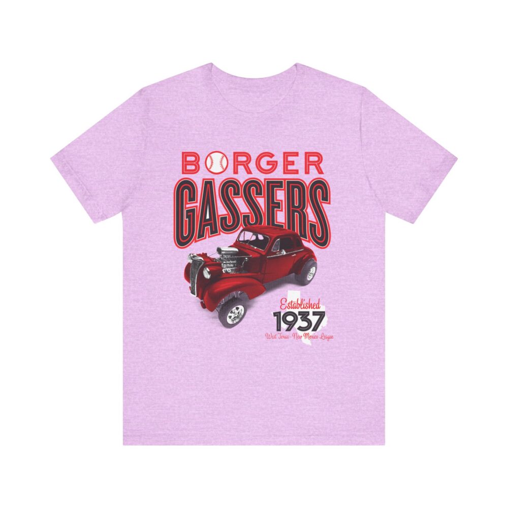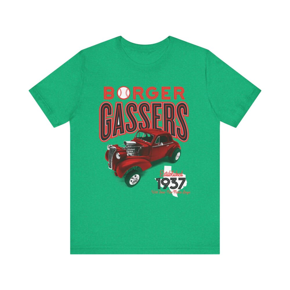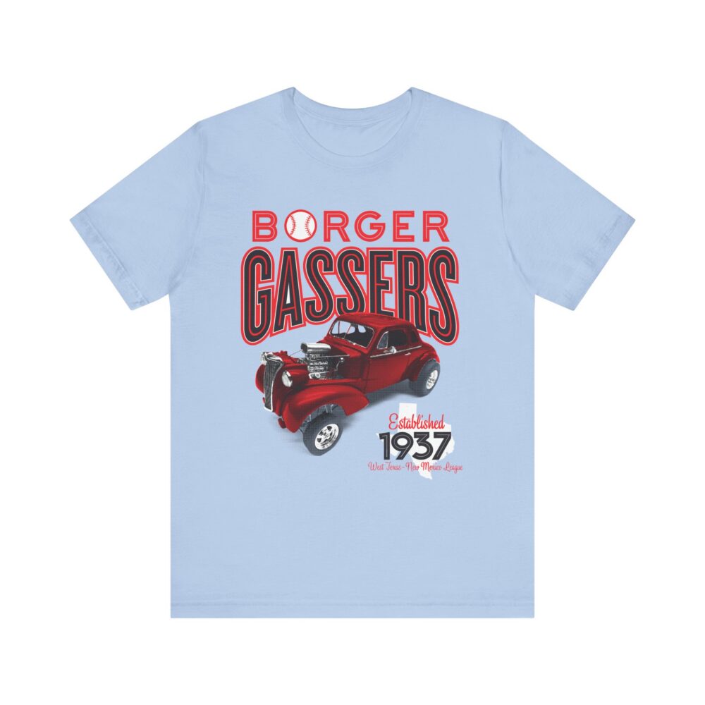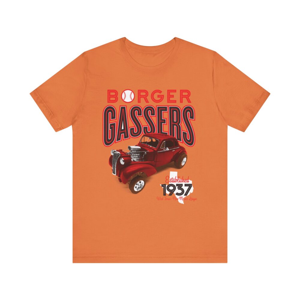 Borger Gassers Baseball T-Shirt pays tribute to the 1937 team from the West Texas–New Mexico League, capturing the energy of the oil boomtown and the grit of grassroots baseball. With a roaring hot rod front and center, this tee fuses automotive flair with classic baseball pride — perfect for fans of vintage speed and small-town sports legacy.